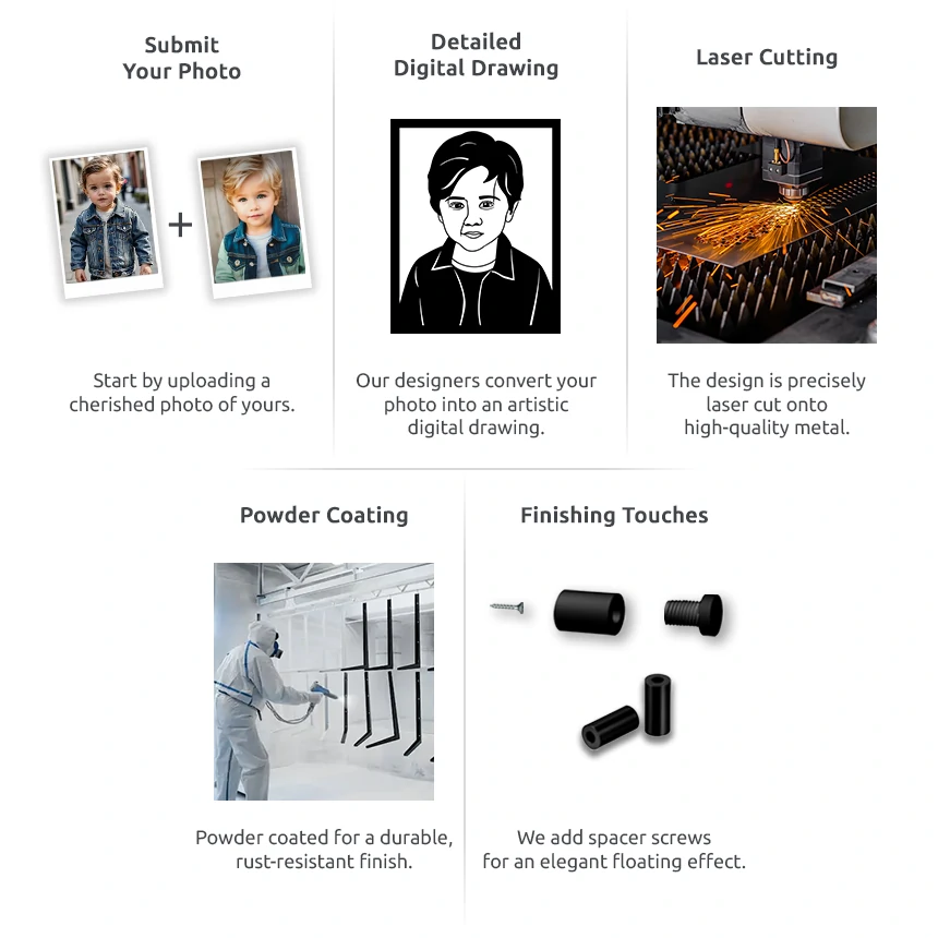 Starting with precise laser cutting for immaculate outlines, our metal artworks are then brought to life through meticulous handwork.