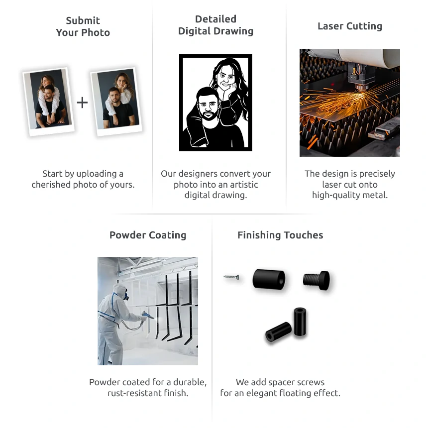 Starting with precise laser cutting for immaculate outlines, our metal artworks are then brought to life through meticulous handwork.
