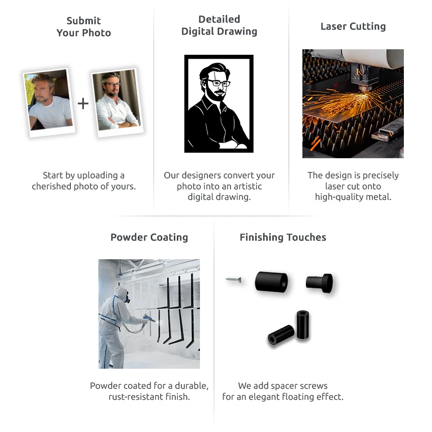 Starting with precise laser cutting for immaculate outlines, our metal artworks are then brought to life through meticulous handwork.